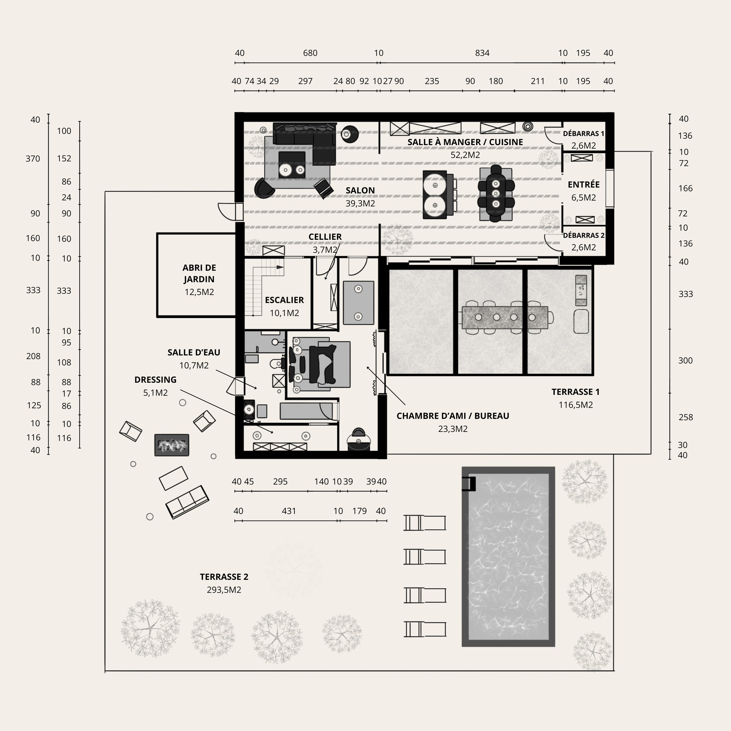 Le rez-de-chaussée propose désormais un espace de vie fluide et accueillant, propice aux moments partagés, ainsi qu’une chambre d’amis totalement indépendante avec bureau, dressing, salle d’eau et accès direct à la terrasse. L’ensemble gagne en fonctionnalité, en confort et en harmonie.